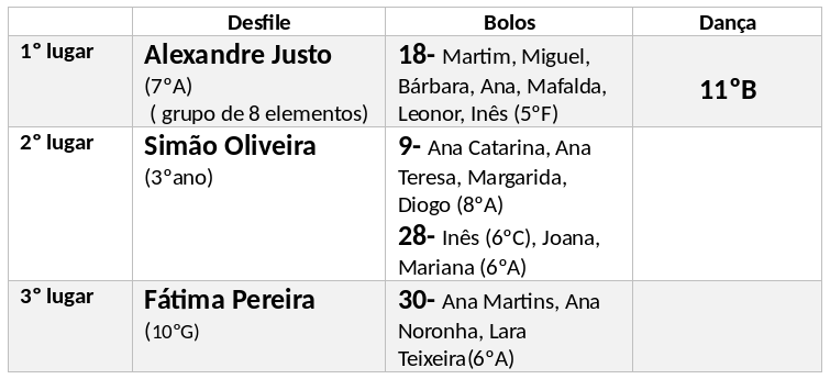 Nesta edição, como já vem sendo hábito, os alunos foram chamados a participar em vários concursos: dança, bolos decorados e fantasias.