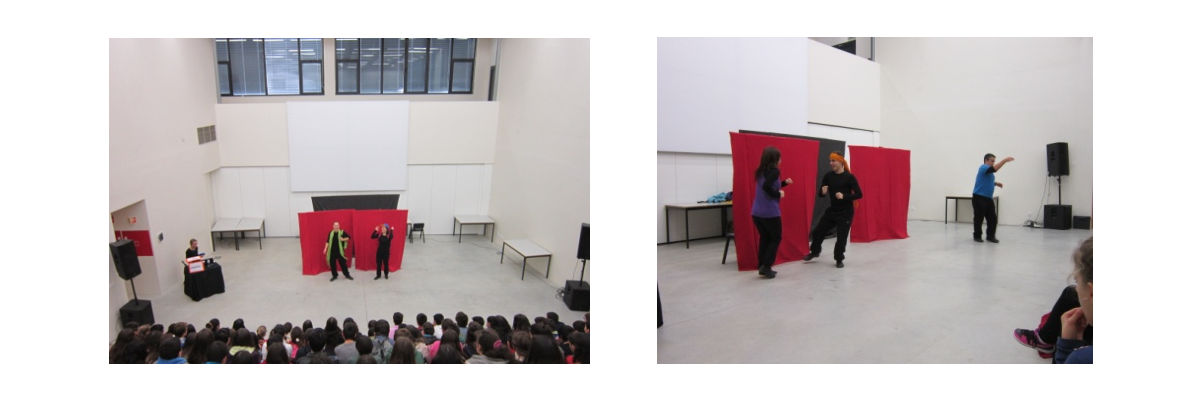 No último dia de aulas do 1º período, os alunos do 8ºano das turmas 8ºD, 8ºH, 8ºB e 8ºG (96 alunos) tiveram a oportunidade de assistir ao teatro-debate (IN) Dependências realizado pela companhia de teatro USINA.