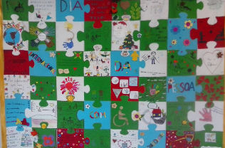 Este ano realizou-se um trabalho coletivo de desmitificação da deficiência, que consistiu num puzzle gigante, com a colaboração de diversas turmas, desde o pré-escolar ao básico, bem como de alguns alunos isoladamente.