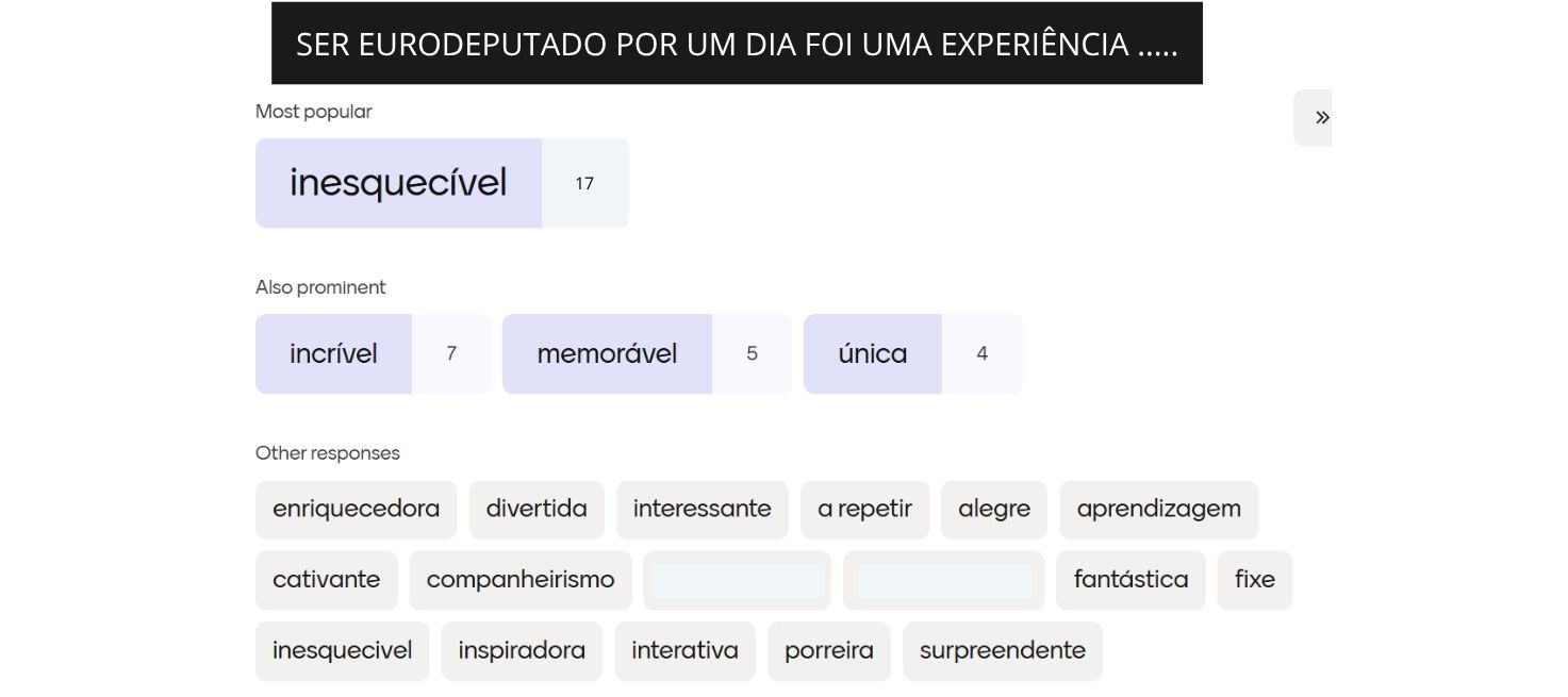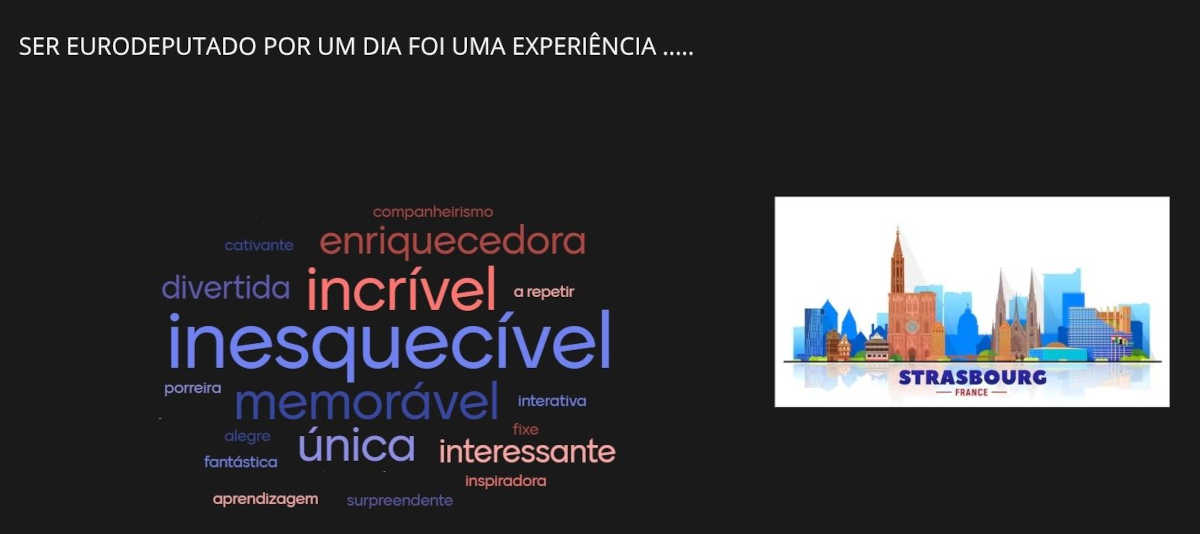 Participar numa sessão Euroscola é sempre uma experiência educativa com forte impacto na formação integral dos jovens alunos e na sua forma de se relacionar com a cidadania europeia. Aliciante, desafiante e promotora de aprendizagens múltiplas e significativas a todos os níveis. Mas quisemos saber o que os nossos Embaixadores Juniores sentiram, viveram durante aqueles dias e pedimos-lhes que definissem essa experiência em algumas palavras. Vejam o resultado. INESQUECÍVEL!