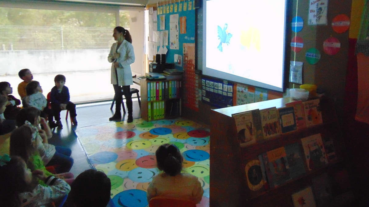 Com o intuito de sensibilizar as crianças para a descoberta, o questionamento e o espírito de observação sobre o que nos rodeia, iniciou a atividade com uma pequena história com recurso ao quadro interativo.