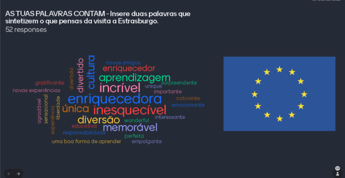 Os alunos fizeram a reportagem dos quatro dias de viagem. A apresentação Mentimeter traduz o que os alunos extraíram desta fantástica experiência, que foi muito e muito significativo, como traduzem as palavras escolhidas.