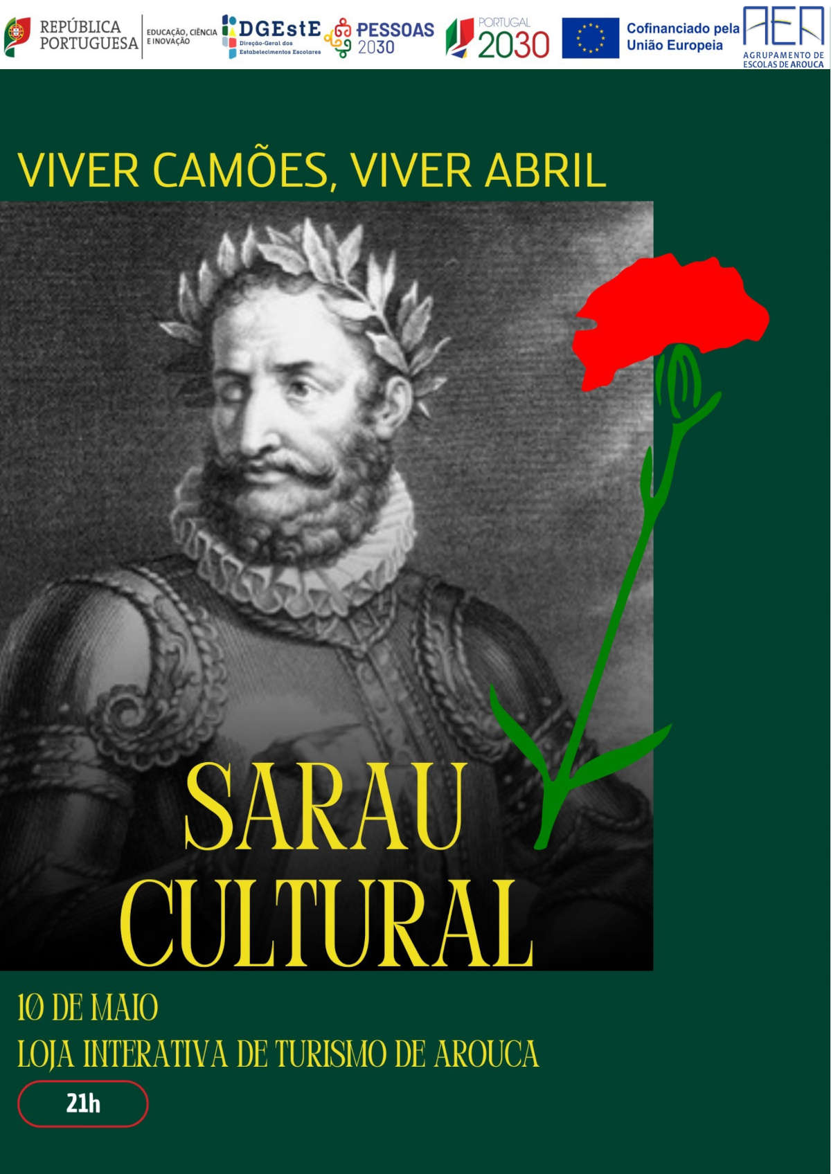 No passado dia 10 de maio, o Agrupamento de Escolas de Arouca dinamizou um emocionante Sarau Cultural, em honra a Camões e ao 25 de Abril, sem esquecer o Dia Mundial da Língua Portuguesa, “Uma língua de todos (…) e para todos (…) uma língua cheia de mundo.”. Sob o tema "Viver Camões, Viver Abril", os alunos e professores uniram-se para uma noite repleta de poesia, música e dança.