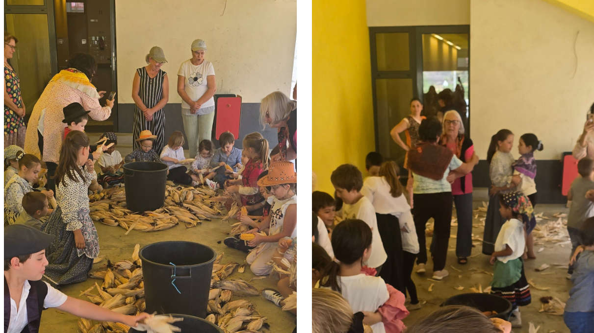 Na escola, alunos e seniores reuniram-se para viver a tradição rural da desfolhada, que celebra o fim do ano de colheitas e fortalece os laços sociais na comunidade. Os alunos tiraram as espigas à planta do milho, prática que foi acompanhada por cantigas tradicionais, entoadas pelo grupo “As Cantadeiras de Canelas”. Foi uma tarde muito animada, que promoveu aprendizagens significativas e socioemocionais, pela interação entre as crianças, seniores e cantadeiras, em momentos de partilha genuína.