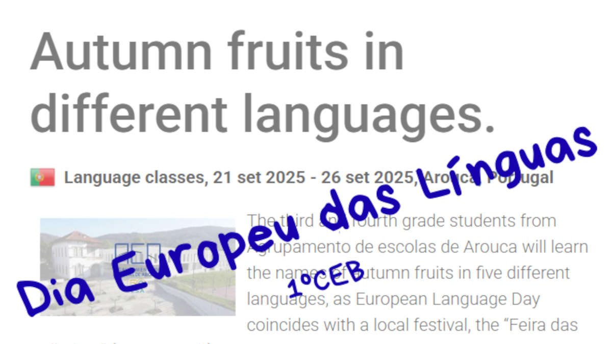 A atividade proposta aos alunos foi inspirada na Feira das Colheitas, especialmente no cartaz de divulgação do evento, em associação com o currículo local. Os alunos descreveram o poster, nos seus rasgos de modernidade e tradição, e identificaram alguns elementos que o compunham. Tendo em conta que a principal festa do nosso concelho celebra as tradições, a cultura e os produtos locais, os alunos aproveitaram para descobrir a riqueza das línguas, aprendendo a dizer o nome de alguns frutos típicos desta época em diferentes idiomas, incluindo, numa turma, o húngaro, por um aluno ter família húngara e conhecer algumas palavras, o que despertou a curiosidade de todos.