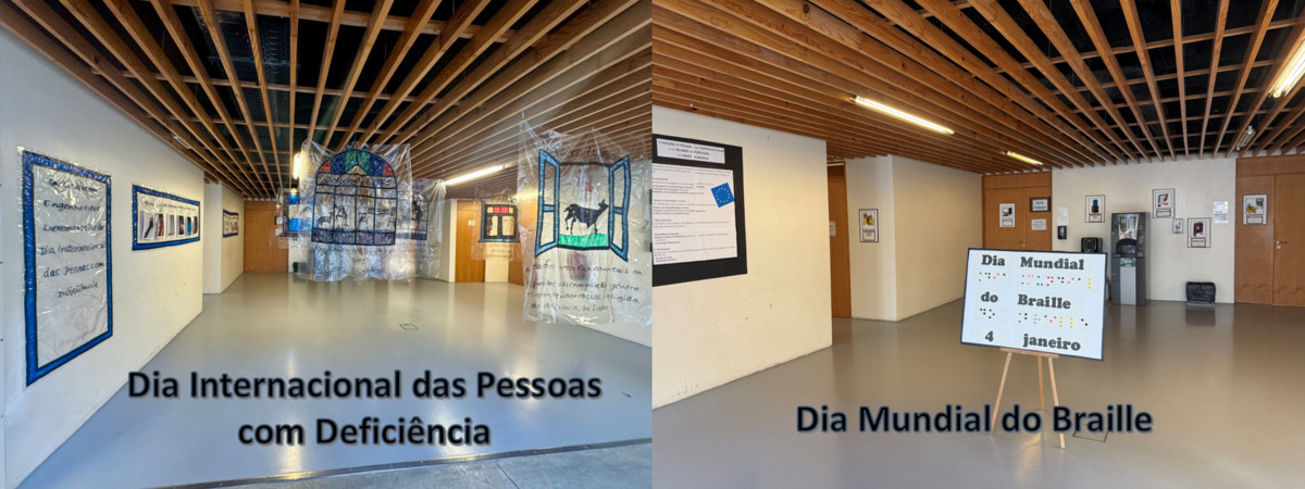No átrio da sala de professores, a comunidade pôde ainda contactar com sinalética em relevo e dupla leitura (Braille e tinta), além de conhecer as diretrizes da UE para a plena participação e inclusão das pessoas com deficiência visual: Acessibilidade, Acesso à Informação e Cultura, Vida Autónoma e Participação (ex. acesso ao voto).